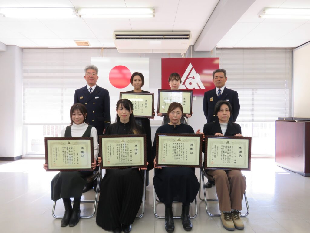 22 11月 2023 消防表彰の感謝状贈呈式を行いました。 by ヨコタアカウント | posted in: 総務課 | 0 ◆ 救急救命功労者に感謝状を贈呈 芳賀地区広域行政事務組合消防本部では、令和5年11月16日(木)、救急活動協力者6名に対し感謝状を贈呈しました。 本事案は令和5年6月21日(水)栃木県真岡市内の飲食店で心肺停止に陥った傷病者に対して、同飲食店の従業員と来客者の方が協力し迅速な119番通報、AEDを早期に使用し適切な一次救命処置を施しました。協力者の冷静な判断と連携により傷病者の一命をとりとめ、傷病者は無事に社会復帰されました。 【感謝状贈呈の様子】